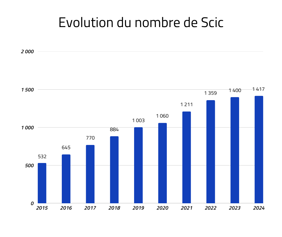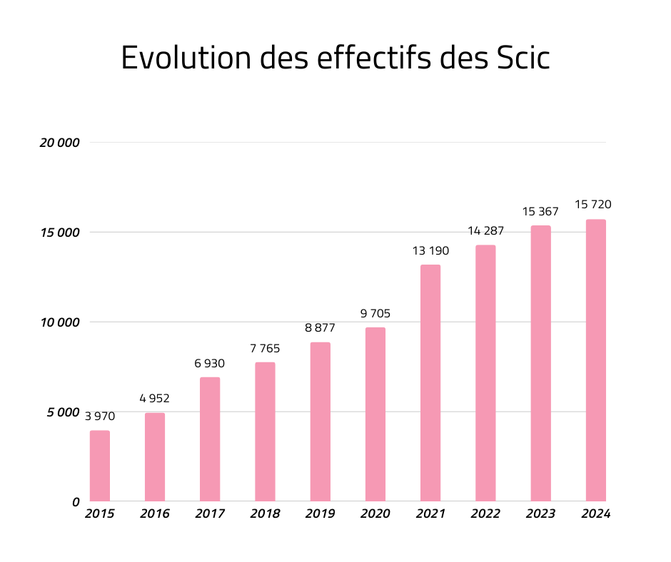 Les Scic poursuivent leur développement en 2024 : elles sont au nombre de 1 417 à fin 2024 (+3 % par rapport à 2023), pour un total de 15 720 salariés (+6 %) et 1,6 milliard d’euros de chiffre d’affaires (+14 %).